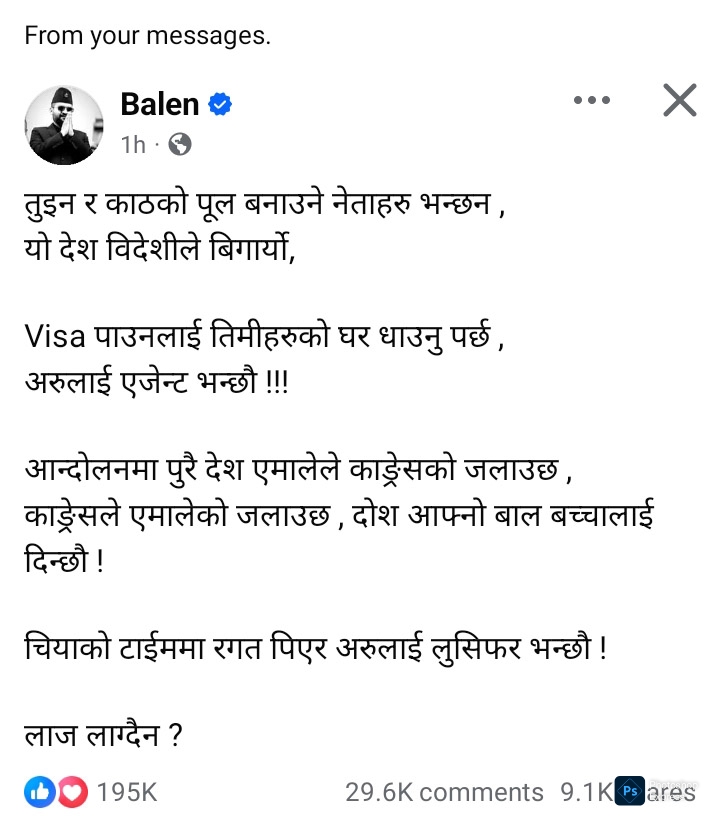 कांग्रेस, एमालेका केही नेताहरूले बालेनले नै जेनजी आन्दोलनलाई पर्दापछाडि बसेर उचालेको आरोप सार्वजनिक मन्चहरूमा लगाउँदै आएका छन्। यसैलाई लिएर आज उनले त्यसको जवाफ दिएका हुन् ।