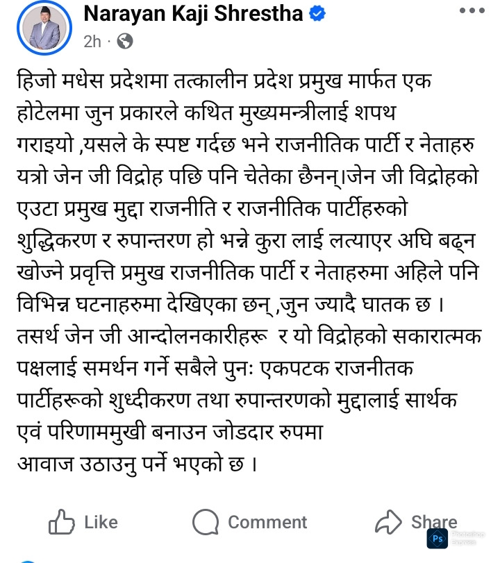 उनले भनेका छन्, ‘हिजो मधेस प्रदेशमा तत्कालीन प्रदेश प्रमुख मार्फत एक होटेलमा जुन प्रकारले कथित मुख्यमन्त्रीलाई शपथ गराइयो, यसले के स्पष्ट गर्दछ भने राजनीतिक पार्टी र नेताहरू यत्रो जेनजी विद्रोह पछि पनि चेतेका छैनन्।’