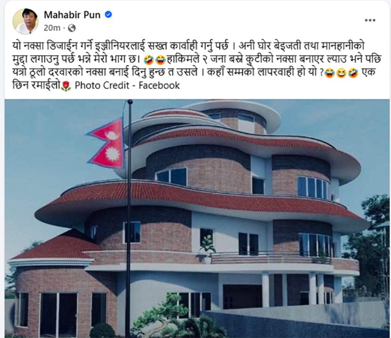 ‘एकछिन रमाइलो’ भन्दै उनले फेसबुकमा लेखेका छन्, ‘यो नक्सा डिजाइन गर्ने इञ्जिनियरलाई सख्त कारबाही गर्नुपर्छ । अनि घोर बेइजती तथा मानहानीको मुद्दा लगाउनु पर्छ भन्ने मेरो भाग छ । हाकिमले २ जना बस्ने कुटीको नक्सा बनाएर ल्याऊ भनेपछि यत्रो ठूलो दरबारको नक्सा बनाइदिनु हुन्छ त उसले । कहाँसम्मको लापरवाही हो यो ?’